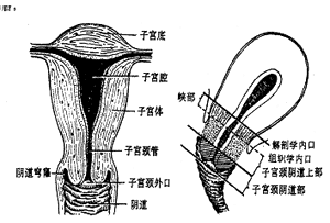 子宮腔為一上寬下窄的三角形。在子宮體與子宮頸之間形成最狹窄的部分稱子宮峽部,在非孕期長約1cm。子宮峽部的上端,因在解剖上較狹窄,又稱解剖學內口;峽部的下端,因黏膜組織在此處由子宮腔內膜轉變為子宮頸黏膜,又稱組織學內口。宮頸內腔呈梭形,稱子宮頸管,成年婦女長約3cm,其下端稱為子宮頸外口,連接陰道頂端,故子宮頸以陰道附著部為界分為兩部分,即宮頸陰道上部和宮頸陰道部。未產婦的宮頸外口呈圓形;已產婦的宮頸外口受分娩影響形成橫裂形成而分為前唇和后唇(“一”字型)。