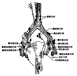 盆腔淋巴分為3組:髂淋巴組(又分為髂總、髂外和髂內)、腰淋巴組、骶前淋巴組。陰道下段的淋巴引流,主要入腹股溝淋巴結。陰道上段淋巴引流基本與宮頸引流相同,大部匯入閉孔淋巴結與髂內淋巴結;小部匯入髂外淋巴結,并經宮骶韌帶入骶前淋巴結。子宮體及底部淋巴與輸卵管、卵巢淋巴均輸入腰淋巴結;子宮體兩側淋巴可沿圓韌帶進入腹股溝淺淋巴結。