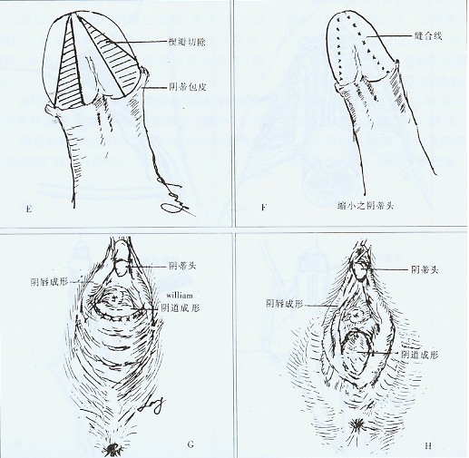 陰道成形術(shù)式視會(huì)因區(qū)域情況選擇:如尚有短陰道,或尿道至肛門(mén)距離較遠(yuǎn),可做穴道,采用皮瓣、羊膜鋪襯諸法;如該區(qū)域狹小,造穴有困難,可做William法(圖G、圖H)。
