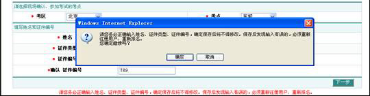 填寫完基本信息后,(姓名、證件號等基本信息時考生請認真仔細核對填寫的正確性,姓名一欄只允許填寫漢字、拼音和“·”,且最多填寫20個漢字,如果姓名中存在無法錄入的漢字,請以拼音代替),點擊下一步系統提示對話框,如圖