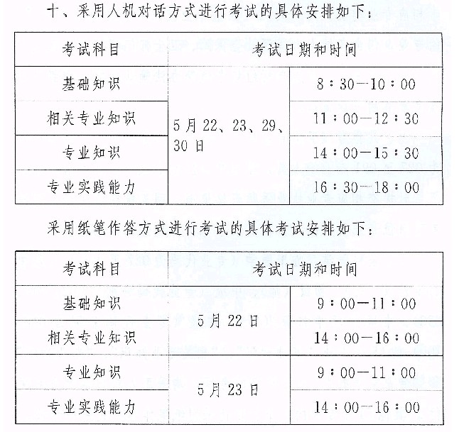 65個(gè)專業(yè)的基礎(chǔ)知識(shí)、相關(guān)專業(yè)知識(shí)、專業(yè)知識(shí)和專業(yè)實(shí)踐能力4個(gè)科目的考試,均采用人機(jī)對(duì)話的方式進(jìn)行,考試時(shí)間為2010年5月22日、23日、29日、30日。