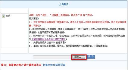 在上傳照片界面,仔細閱讀紅色提示(注:照片的大小為一寸或兩寸,文件大小必須在15kb-45kb之間),點擊“瀏覽”,上傳照片并“保存”。見下圖: