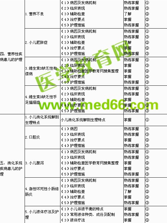 | 4.小兒的營養與喂養 | (1)小兒能量與營養素的需要 (2)嬰兒喂養 (3)兒童少年膳食安排 |