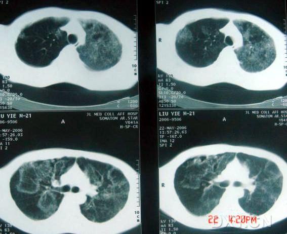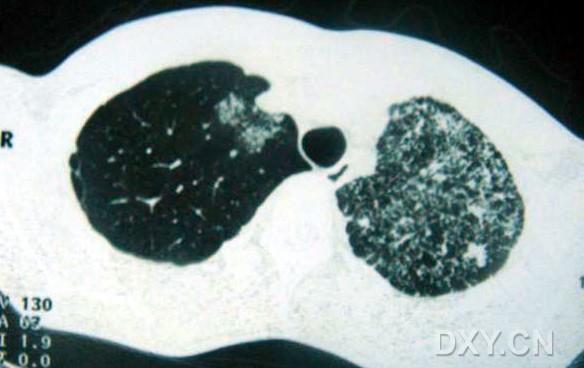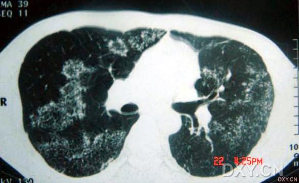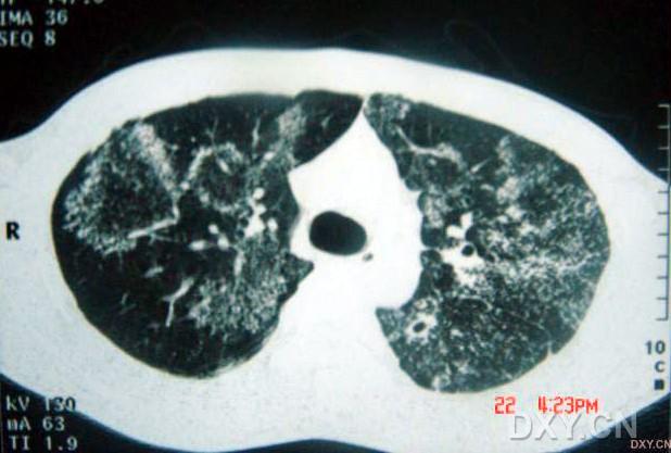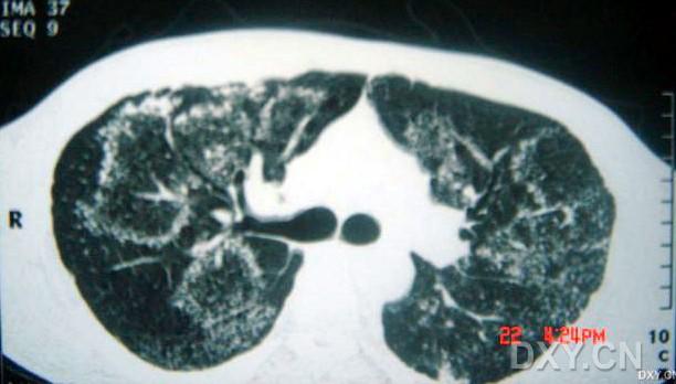 兩肺彌漫性顆粒狀陰影,部分陰影融合呈團塊狀,可見支氣管氣相;