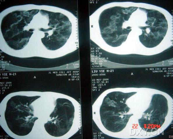臨床表現(xiàn)提示為非細菌性感染性疾病,ct表現(xiàn)為以肺泡實變?yōu)橹鞯膹浡躁幱埃?/font>