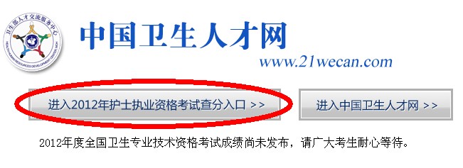第一步:點擊紅色圈圈位置,進入2012年護士資格考試成績查分入口>>>。