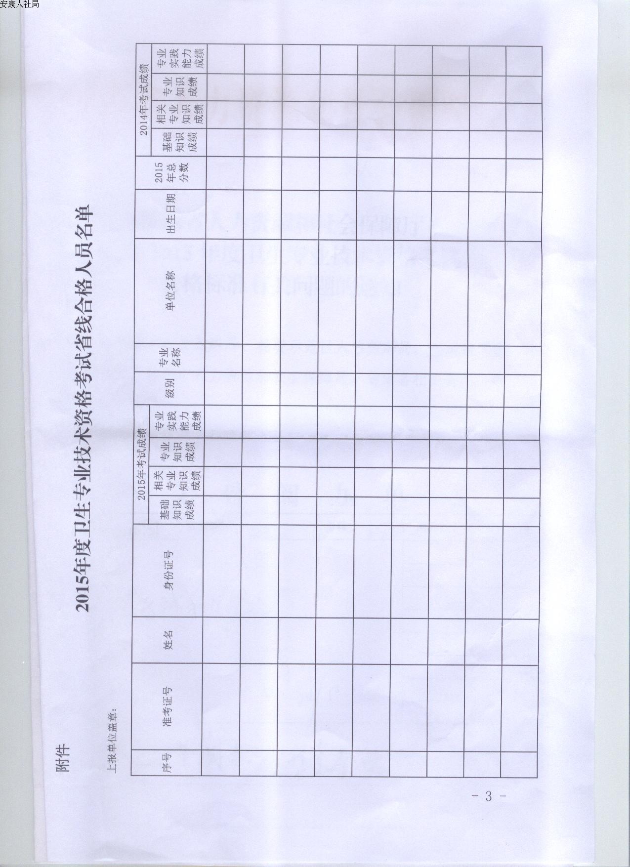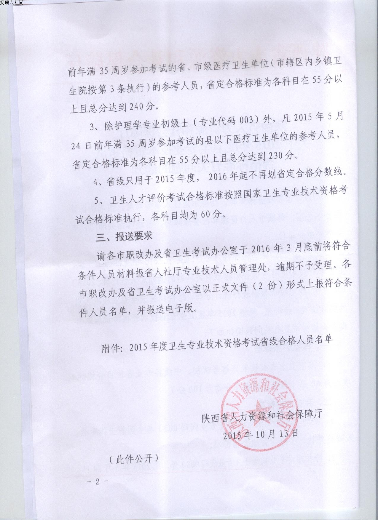 現將陜西省人力資源和社會保障廳《關于2015年度衛生專業技術資格考試合格標準有關問題的通知》(陜人社函〔2015〕871號)轉發給你們,請各單位及時做好政策宣傳、資料收集和匯總上報工作,務必于2016年1月25日前將符合省定合格標準考生申報資料(《陜西省專業技術資格考試合格人員登記表》2份、《安康市資格證書辦理申報表》1份、準考證同一底版二寸照片3張、成績單原件和復印件)以及《2015年度衛生專業技術資格考試省線合格人員名單》(紙質和電子版)報市人社局專技科,逾期不予受理,相關表格可在市人社局網站相關下載欄下載。