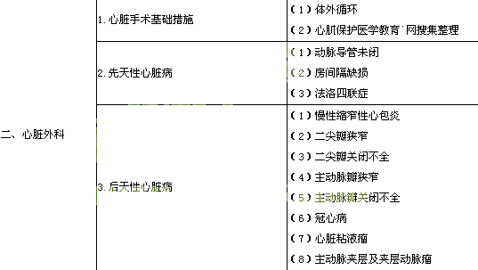 | 一、普胸外科 | 1.胸部損傷 | (1)肋骨骨折 (2)血胸 (3)氣胸 (4)氣管損傷 (5)胸腹聯(lián)合傷 (6)心臟損傷 |