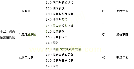 | 7.腦缺血性疾病 | (1)病理生理 (2)臨床分類與臨床表現(xiàn) (3)診斷和鑒別診斷 (4)外科治療 |