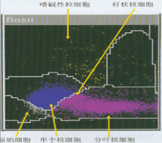 血液與酸性表面活性劑反應,不僅紅細胞溶解,而且除嗜堿性粒細胞外,其他所有白細胞膜均被破壞.胞質溢出,僅剩裸核。當激光束照射到細胞時,產生不同強度的散射光,形成二維細胞圖,其中,嗜堿性粒細胞呈高狹角散射,定位于細胞圖上部,裸核細胞則位于細胞圖下部。